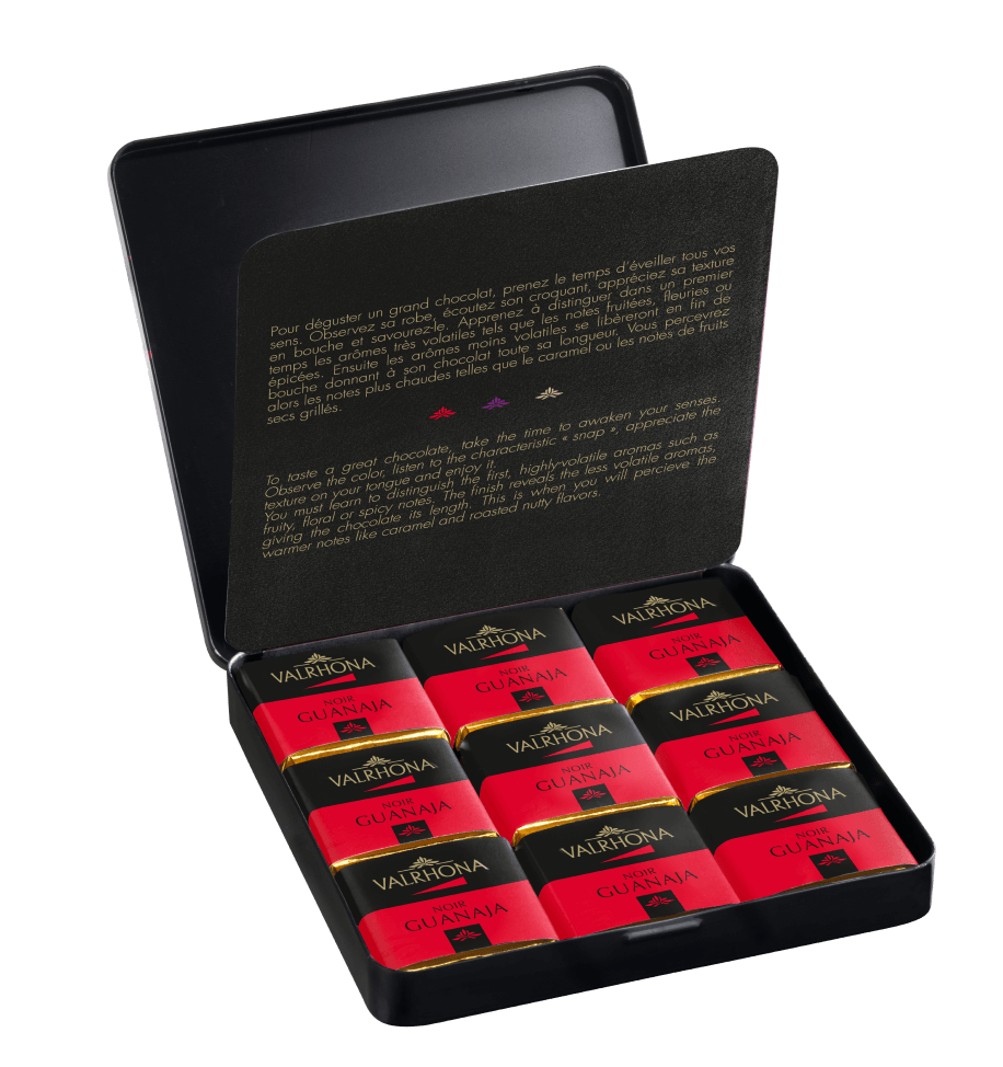 By blending different grand Crus, Valrhona created the world’s bitterest chocolate, Guanaja 70%. It was a near-instant success with professionals and consumers alike. The ideal accompaniment to coffee, it was presented in 5g “bitesize” squares in a metal container inspired by cigar boxes.