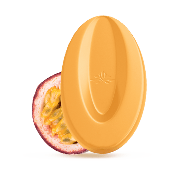 The Passion Fruit Inspiration fruit couverture is a subtle blend of cocoa butter, sugar and passion fruit. Sweet, gourmet and with a touch of tang, Passion fruit brings to mind the sun and tropical countries that it comes from. Its unique and subtle taste adds a dash of sunshine to summer desserts. Passion fruit is a completely unique flavor which can be difficult to work with, but Valrhona wanted to make it accessible to all thanks to our Passion Fruit Inspiration couverture.