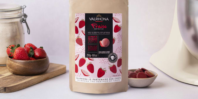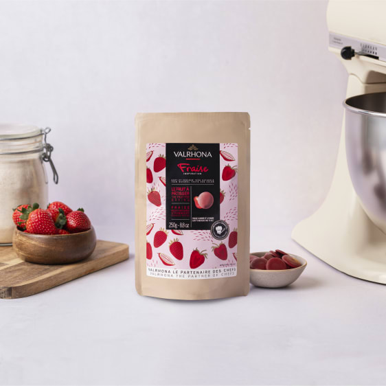 The Strawberry Inspiration fruit couverture is a subtle blend of cocoa butter, sugar and strawberry. Strawberry Inspiration adds a new dimension to fruit-flavored recipes. It was born out of a collaboration between Valrhona’s R&D team and some of its customers, and their belief in their product was rewarded when Inspiration won the Grand Prize at the Sirha Innovation Awards 2017.