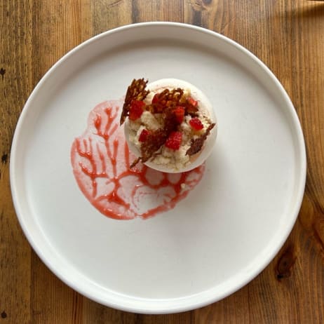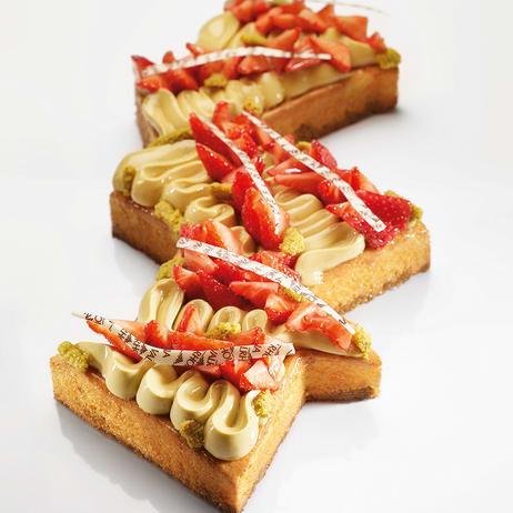 9 stepsPistachio strawberry ganache tart with toasted milk ice cream