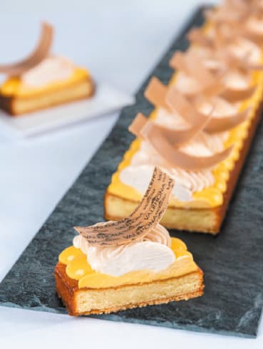 With a rolling pin, roll out the Almond Shortcrust Pastry to a thickness of 2.5mm and bake in 60 x 10cm frames. Use a piping bag (no nozzle required) to pipe on approx. 600g of Vanilla-Flavored Almond Cream. Bake at 180°C (355°F).Once cooled, turn out and use a piping bag with a 10mm nozzle to pipe approx. 450g of Mango and ALMOND INSPIRATION whipped ganache into the tart in little droplet shapes. Whip up the whipped ganache and use a piping bag with a no. 18 fluted nozzle to pipe 350g onto each strip.Freeze.