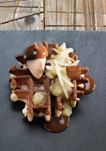 Sprinkle the cooked Plain Waffles with confectioner's sugar and then caramelize under a salamander. Place a warm waffle on a plate and add around 30g of Granny Smith and Fennel Compote. Decorate with a few pieces of Poached Fennel. Place a quenelle of Hazelnut Praliné Sorbet on top of the waffle and finish with some Hazelnut Praliné Sauce. Serve immediately.