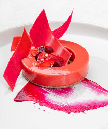 Blast freeze the molded Strawberry Crémeux and unmold.Place on a Silpat and spray with the ABSOLU CRISTAL Spray Glaze. Return to the freezer.Cut the Buckwheat Sablé with an 8cm round cutter, then use a 4.5cm cutter to remove the center and create a donut shape. Bake the bases on a Silpain-lined perforated sheet pan at 310-315˚F (154-157˚C) until light golden brown.Create décor for garnish by spreading tempered STRAWBERRY INSPIRATION between two rectangular strip guitar sheets. Using a bicycle cutter, cut strips on an angle of various widths, then place in a curved tuile mold.Once crystalized, remove the guitar sheets and use a paper coronet to pipe thin lines on the end of the décor. Dust with beet powder and set aside.Once the Buckwheat Sablé bases are cooled, place the sprayed Strawberry Crémeux on the base and allow to defrost slightly.On a white plate, place a spoonful of the Raspberry Beet Sauce and spread with a small offset spatula.Place the Strawberry Crémeux with the base on the Sauce, then pipe an additional 20g of Sauce in the center of the ring.Garnish with STRAWBERRY INSPIRATION décor, Berry Beet “Salad”, toasted buckwheat and freeze dried strawberry pieces.
