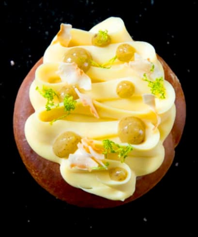 Proof the Medium Rich Brioche Buns for approximately 3 hours, until triple volume. Egg wash the Brioche and place a Passion Fruit Inspiration Cheesecake insert into the dough. Bake the Brioche at 168°C (335°F), for approximately 10-11 minutes (ovens vary so adjust bake time and temperature to desired color and texture, not very dark and soft, not dry). Garnish with toasted coconut chips, fresh lime zest, and confectioner's sugar.