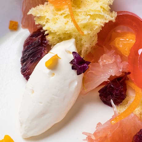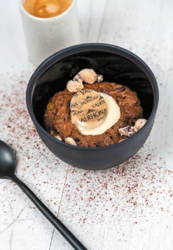 Make the brownie dough, namelaka, Blond Orelys crème anglaise and sugar-coated nuts.Line the outside of a 4.5cm-diameter ring with a strip of baking paper – Use some melted butter to stick it on.Place the ring in the center of the small casserole dish, then use a piping bag (no nozzle required) to evenly weigh out 80g of browniearound the outside. Bake at 345°F (175°C) for approx. 12 minutes.Leave to cool, then remove the ring.Use a piping bag with a no. 14 smooth round nozzle to pipe 20g of Blond Orelys namelaka onto the center of the brownie in dropletshapes.Pour the crème anglaise into the middle, right up to the top of the brownie (approx. 15g).Decorate with a few sugar-coated nuts and a logo.