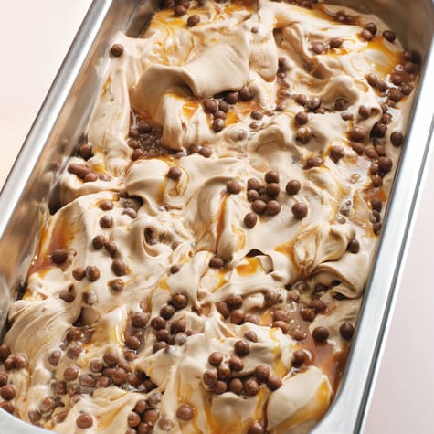 When the ice cream is churned, swirl in the caramel sauce and Caramélia chocolate pearls using a rubber spatula.