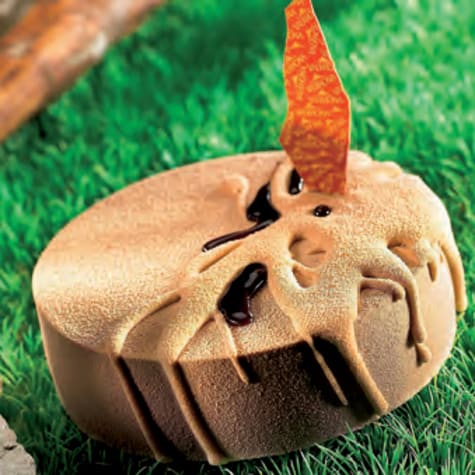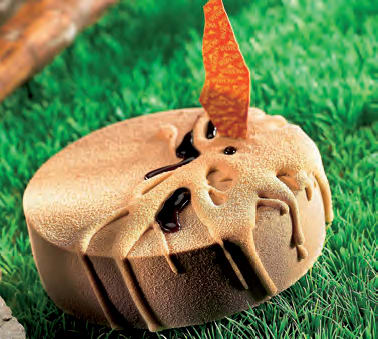 Cut out 4 discs of chocolate sponge using a 14 cm diameter ring.Line 14 cm cake ring with plastic strips and place the chocolate sponges in. Quick freeze.Make the Caramel Crèmeux ORIZABA LACTEE 39%, let it cool down to thicken before pouring over the chocolate sponge.Sprinkle some crunchy chocolate pearls all over. Quick freeze.For the final assembly, line 16 cm cake rings with plastic strips.Make the ORIZABA LACTÉE 39% Lightened Mousse, place the frozen previous assembly in and pour immediately 330 g of mousse in the 16 cm cake rings and quick freeze.Pastry Chef's Tip: Being very rich in sugar, it is better to keep the caramel crémeux in the freezer to the last minute before finishing the assembly (when pouring the ORIZABA LACTÉE 39% Lightened Mousse in).Remove the rings. Whip some whipping cream to a runny stage.With a rubber spatula maryse, make drizzles of cream over the cakes. Quick freeze the lot.Spray the frozen cakes with the extra fluid couverture in order to get a velvet effect.Mix some VALRHONA ABSOLU CRISTAL glaze with coffee paste or caramel colouring, warm it slightly in the microwave.Make some drizzles of glaze and decorate with an in house chocolate logo.