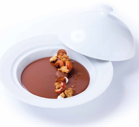 Place the pudding in a pastry bag fitted with a large straight tip. Pipe in a circle starting in the center of the dish and piping outward. In another pastry bag with a smaller straight tip, place the caramel cremeux. Pipe several dollops directly on the pudding. Garnish with candied cashews, cookie crumble, whipped crème fraiche and logo chocolate décor. Drizzle with bourbon sauce.