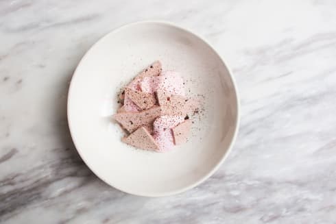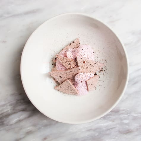 Use a #40 scoop (.75 oz) to scoop the Namelaka on the bottom of a shallow bowl. Use an offset spatula to spread out a little. Tear shards of beet cake and press gently on top of the Namelaka. Use a slotted spoon to add about 7-8 pieces of marinated beets, with a little bit of liquid. Alternate large shards of meringue with shards of hibiscus frozen yogurt. Grate the top of dessert with black lime before serving.