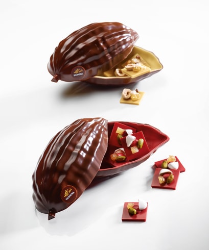 Molding: Use the pre-set Guanaja spray mix to spray the inside of the cocoa pod molds (product ref. 10841), then leave them to harden.Use the pods to mold the pre-set Guanaja couverture.Turn out and leave the couverture to spread for a few moments, then smooth away any excess.Drain the molds by holding them suspended over two rulers.Before hardening is complete, trim away any excess, then mold again. Tap the mold to get the thickness you require.Leave to harden, trim again, then refrigerate for a few minutes then leave at a temperature of 65°F (17°C) until the chocolate is ready to slip out of its mold.Assembly: Turn out the half-pods and fill them with 12-15 mendiants. Slightly soften the half-pods, then assemble them together.