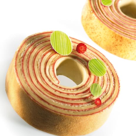 Place the half-spheres of JIVARA 40% namelaka in SILIKOMART Multiflex 40ml cylindrical silicone molds. Pour in the PASSION FRUIT INSPIRATION light mousse until each mold is filled right to the top. Freeze.