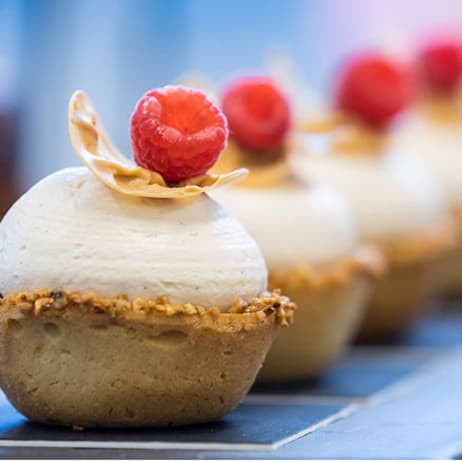 Once frozen and turned out, pick up the little cakes from the top center so you can coat the sides with glaze and immediately cover them with grated coconut. Place each one on a disk of almond shortcrust pastry. Decorate the top with fresh passion fruit. Store in the refrigerator for 3 hours before use.