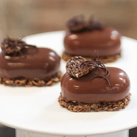 Hydrate the gelatin in an ice bath. Melt Valrhona Ivoire Chocolate and set aside. Bring the coconut purée to a boil and mix with the white chocolate and gelatin, cool to 37℃. Whip heavy cream to stiff peaks, and fold into the coconut chocolate mix. Fill a round disk mold halfway and add the Coconut Daquoise rounds. Smooth out the mold with a spatula using extra mousse if necessary, and freeze.