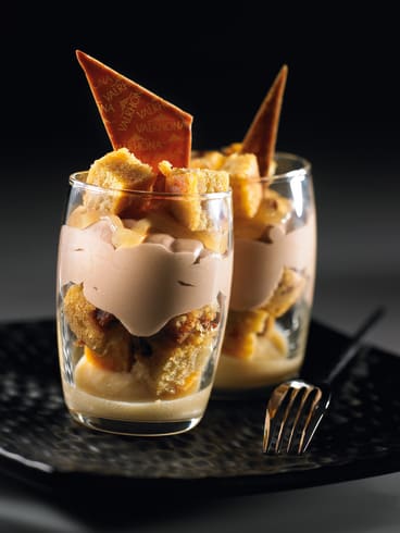 Weigh out 700 g of the cake mixture and pour into a raised edge 34 x 34cm silicone mat and bake for 12 minutes at 170°C (338°F).Place the verrines in the freezer.Temper the Banana Passion Fruit Cream to 20 - 25°C (68-77°F) and then use a piping bag without a nozzle to add 20 g to each verrine, tilting the glasses to create a wave effect. Blast freeze.Cut the Banana Cake into 5 cm cubes and add around five cubes of cake and a few CARAMELIA CRUNCHY PEARLS (8425) to each verrine. Blast freeze.Make the Bahibé Chaï Mousse and immediately add around 35 g to each verrine. Blast freeze.To finish, pour on a little Taïnori and Bahibé Chocolate Sauce, add a cube of banana cake and a house logo.
