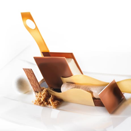 Finishing Touches: Turn out the half-eggs and take away the part you have cut out. Place each half-egg on a tray lined with a baking mat. Make and temper the spray mix. Spray the half-eggs with a low-pressure spray gun (0.4 to 0.8 bars) to create a “Jurassic egg” look and leave to set at 60-65°F (16-18°C). Use some pre-crystallized chocolate to stick an egg base in each pierced half-egg. Use a guitar cutter to cut the chocomels into ingot shapes and wrap them individually. Finish off by assembling the half-eggs using a hot plate, adding the chocomel ingots in each one before sticking them together.