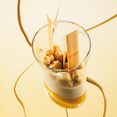 Chocolate decoration:Spread some tempered DULCEY 32% chocolate between two silicone sheets and cut into 1.5 x 10cm rectangles with an extendable wheeled cutter.Pipe 30g Mango Banana Marmalade into each verrine and set aside in the freezer for five minutes to freeze the surface of the marmalade.Immediately pour the tempered panna cotta into the glass and set aside in the refrigerator in the fridge.When ready to serve, add 10g of Almond streusel crumbs and a couple of DULCEY 32% chocolate decorations.