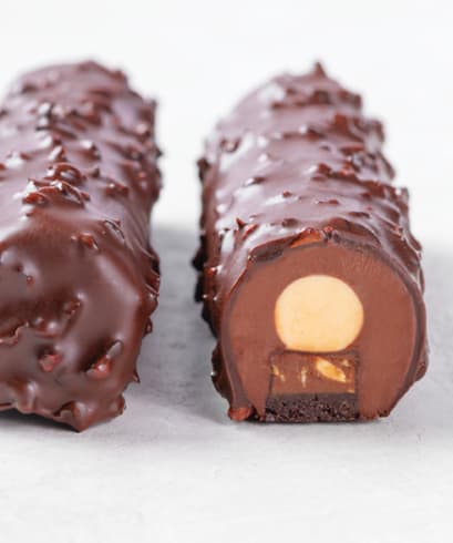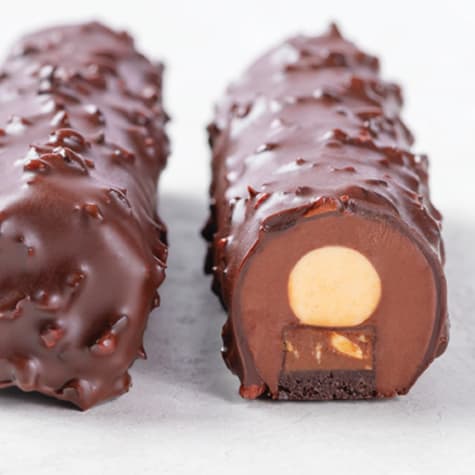 Remove the layered Cocoa Crumble and Crunchy Praliné base from the freezer and let warm slightly before cutting. Cut into 12x1.5cm rectangles. Separate on a Silpat-lined tray, then using a large round tip, pipe the cold Almond Crémeux on top, smoothing the ends with a hot knife.Return the inserts to the freezer. Warm the GUANAJA Crémeux just until liquid but not hot. Pour 50g of GUANAJA Crémeux into a mold (Silikomart SF247) then place the frozen insert inside, making sure the insert is flush with the opening of the mold and the Crémeux is evenly distributed. Repeat with all the inserts, then blast freeze before unmolding.Unmold the bars and place on a glazing rack. Heat the Cocoa Nib Glaze to 95˚F (35˚C) and evenly coat the frozen bars. Place in a covered container and allow to thaw in the refrigerator before serving.