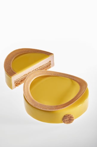 Prepare the Jelly, Passion fruit Caramel, Glaze and Biscuit. Bake the Biscuit and leave it to cool, then cut out 14cm disks.Make the Pressed Shortcrust and spread it into 14cm rings. Use a piping bag without a nozzle to pipe a spiral of 65g of Passion Fruit Caramel onto the Pressed Shortcrust. Cover with a Biscuit disk. Then spread on 70g of Passion Fruit and Mango Jelly and freeze.Turn out the inserts, then make the Mousse. Pour 280g into each ring, then place the insert in the center – Remember, you are assembling your dessert upside down.Spread some tempered ALMOND INSPIRATION between two transfer sheets.Before it completely sets, cut out rings using one 16cm cutter and another 12cm cutter. Curve them slightly and leave them to set. Turn out then ice your desserts. Decorate (see photo).