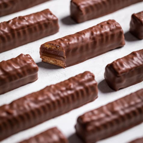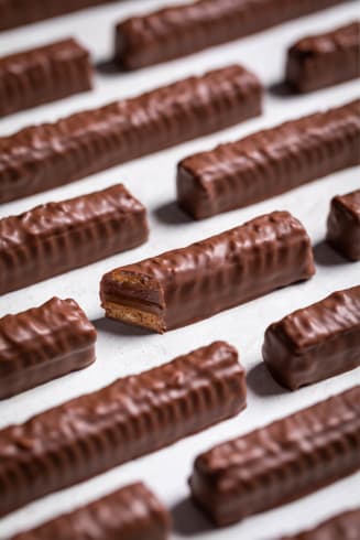 Pipe a fine line of tempered milk couverture and place immediately a Oat Nougatine strip on top.