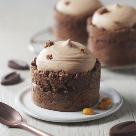 Place 20g of crisp around the edges of the chocolate cakes and use a soup spoon to give each one a curved lip (see photo).