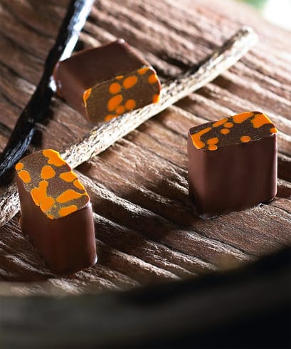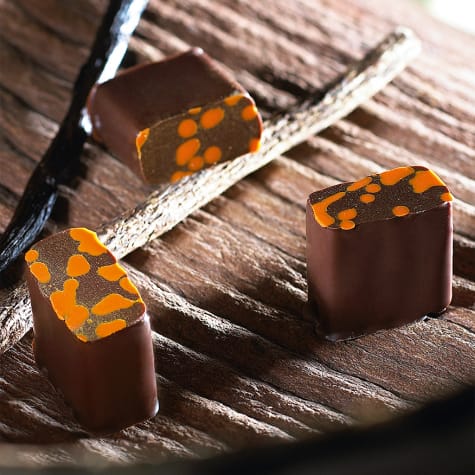Precoat the ganache with dark chocolate couverture then cut 22.5 x 22.5 mm squares.Before coating, turn the ganache on its side so as to coat the cut edge.Coat the ganache rectangles with couverture.Using a paper cornet, make lines and drops of orange cocoa butter tempered at 30/32 °C on a neutral guitar sheet.When the cocoa butter has crystallized, use a brush to dust the surface with gold powder.Immediately after the chocolates have been coated in the machine, press on transfer sheets.Allow to crystallize before removing the backing.