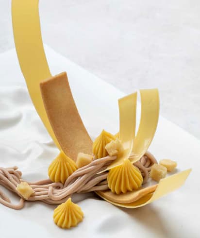 With the Almond Shortbread dough, cut a 2x17cm rectangle and bake in a 18cm cake ring, set aside.On a plate of your choice using a Mont Blanc piping tip, pipe the Almond Crémeux in an abstract pattern onto the almond sable, helping it stand up.Using a star tip, pipe the Passion Fruit Crémuex in an artsy pattern around the Almond Crémeux.Breaking the coconut cake into small pieces, place on and around the 2 Crémeux.