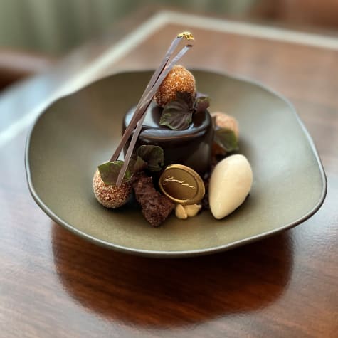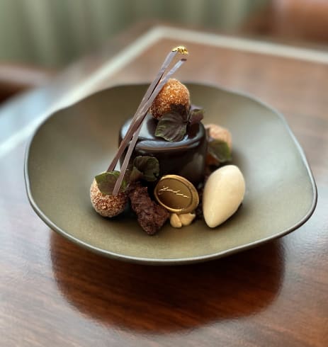 Garnish with shiso greenery, logo plaque and tempered chocolate sticks