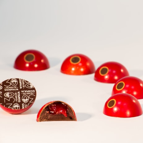 Melt the MANJARI 64% couverture and COCOA BUTTER together at 115-120°F (45-50°C), mix them with the HAZELNUT 60% PRALINÉ. Heat mixture to 115°F (45°C).
