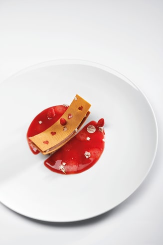 Cut out a 9cm disk of strawberry jelly, cut it in half, then put the two halves in the center of the plate so that they do not quite touch (See photo).