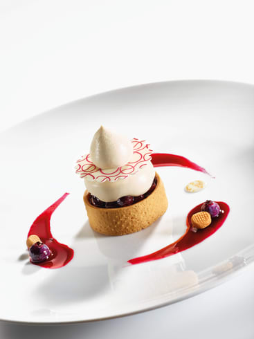 Make the ORELYS Blond whipped ganache and almond shortcrust pastry. Spread out the almond shortcrust oastry to a thickness of approx. 3mm. Then cut out 2 x 18cm strips of shortcrust pastry. Store in the freezer. Use the shortcrust to line 5.5cm diameter rings. Use the offcuts to make a small, 0.5cm-diameter roll. Store this in the fridge, then cut out little 1cm-thick rounds. Bake the pastry in its rings and the small shortcrust rounds on a micro-perforated baking mat. Store in a dry place.Use a spray gun to apply a layer of spray mix onto the rings and little shortcrust rounds to protect them from humidity. Finish the whipped ganache.To make the decorations, finely spread out some pre-hardened white chocolate between two sheets of Valrhona Signature Zigzag Eggs transfer paper. Once this starts to harden, cut out rings using one fluted 6cm-diameter cutter and one plain round 2cm-diameter cutter. Leave these rings to set at a temperature of 61°F (16°C). Sieve the Sosa semi-confit whole bilberries through a chinois to get a juice that will serve as your sauce. Set aside.When you are ready to present your dessert, place a ring of shortcrust in the center of a plate. Using a piping bag with a 16mm-diameter plain round nozzle, pipe a whipped ganache base into the inside of the ring. Then garnish the dessert with Sosa whole semi-confit bilberries (40g) and 3 shortcrust pastry rounds. Add a drop of whipped ganache (30g) onto the bilberries. Put a chocolate decoration in place (see photo). Put another little drop of whipped ganache onto the decoration. Draw lines of sauce around the tartlet. Decorate the dessert with shortcrust rounds and a few bilberries.