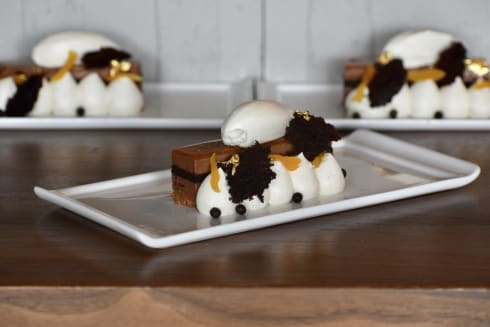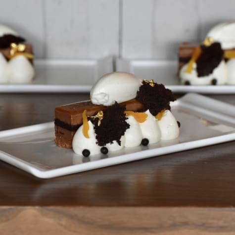 - On top of cake do a medium size quenelle of salted whip. Place on center of cake top, lay down on angle.