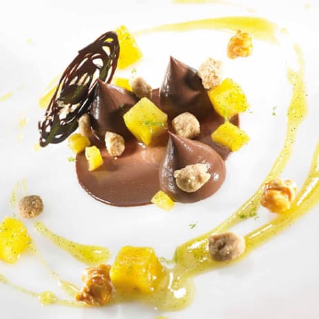 Make a custard with the cream, pineapple pulp, lime juice, banana pulp and egg yolks. Take the hot and strained custard and emulsify using a rubber spatula with the melted chocolate and cocoa butter until smooth, glossy and elastic. Blend to perfect the emulsion, taking care not to incorporate any air and working at a temperature over 35°C (95°F). This technique will ensure the crémeux is always smooth, even after thawing. Leave to set overnight in the refrigerator.
