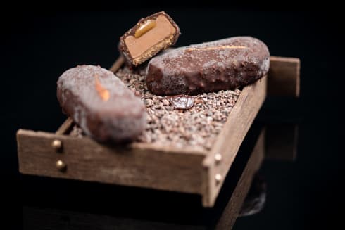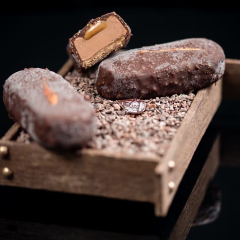 Prepare the Ice Cream and Sauce.Make the Orange-Praliné. Pour into a 4-mm frame (Prod. Ref. 3346).Cut out the oval bases, set on a tray, cover with plastic wrap and store at -18°C (-0.4°F) for assembly.Fill the molds (SF160 Silikomart Savarin Log) with GUANAJA Ice Cream. Insert the Orange-Praliné bases. Freeze.Unmold and arrange the bars on a tray. Add 12g Orange-Caramel Sauce to each bar. Freeze. Check the temperature of the coating. Using a fork, dip the frozen bars into the coating and then place on a tray.Keep in the freezer at -18°C (-0.4°F). Serve between -14°C and -12°C (7-10°F).