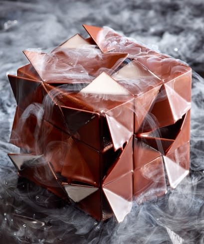 Make the GUANAJA Caramel Cream Mix and put it to one side. Make the GUANAJA Praliné Crunch and spread 80g into a square 10cm mold. Store in the refrigerator. Bake the biscuit and once it has cooled, spread on 600g of GUANAJA Caramel Cream Mix. Freeze. Use a square 10cm mold to cut this out.Make the GUANAJA Crème Anglaise Mousse, then pour 150g into a 11.5cm mold. Put a GUANAJA Biscuit and GUANAJA Cream mix square in place, with the GUANAJA Caramel Cream mix at the bottom. Repeat until you have three layers of Biscuit, then complete the assembly by putting the square of GUANAJA Praliné Crunch in place. Freeze. Make the chocolate decoration by spreading the pre-set dark couverture chocolate. Use a scalpel to cut out 3cm squares and fold them over slightly. Leave to harden. Turn out the dessert, then cover completely with the chocolate decorations to create an origami effect.