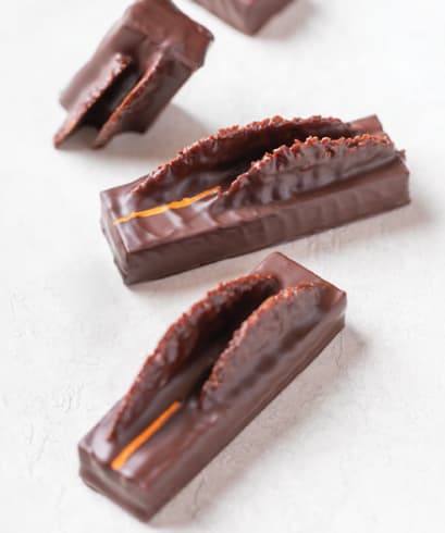 Spread the Lime Almond Paste out to a thickness of 2mm into a 34 x 34cm frame.Immediately pour the Pate de Fruit over the Lime Almond Paste in the frame, to a height of 4mm. Let cool at room temperature.Pour the ITAKUJA Ganache over the chilled frame to a height of 6mm.Leave to set in a cool place for several hours at 63˚F (17°C) and 60% relative humidity, so that it can be easily cut.Coat with dark chocolate couverture, then cut into strips 22.5mm wide. Cut the strips into 8cm slices.After baking, cut the Coconut Tuile in half sphere shapes, and insert into the ganache after making an incisionwith a warm knife.Enrobe with with your Dairy Free VALRHONA Dark Chocolate of choice and let crystallize.