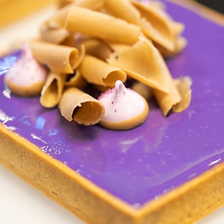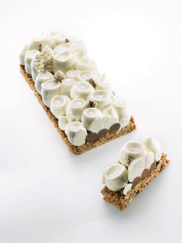 Take 600g Pressed Pecan Praliné Shortcrust per 60 x 10cm strip and set aside in the freezer. TIP: Take care not to crush the shortcrust to avoid too compact a texture. When cool, unmold the strips. Use a 20mm smooth nozzle to add around 400g of Pecan Praliné Crémeux. Blast freeze. Whip the Opalys Vanilla Ganache, and then use a plain 14mm nozzle to pipe irregular blobs of around 700g per strip. Lightly press down the tops of the blobs using a heated melon baller. Blast freeze. Spray the tart strips with the Absolu Cristal Spray Glaze. Prepare the Sweet and Salted Candied Pecans and arrange a few on top. Temper some OPALYS 33% chocolate. Roll out a thin layer between two transfer sheets. Check the thickness and cut out 3cm-diameter discs. Leave to set at 17°C (63°F). When set, remove the chocolate decorations from the sheets and use to decorate the tarts.