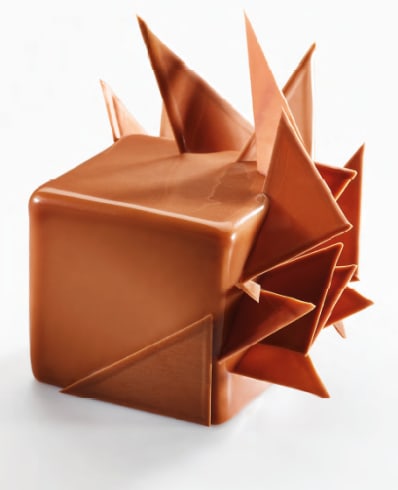 Make the Jivara chocolate snap and spread it into an 18 x 18cm frame – Be careful not to press down too much. Store in the refrigerator. Make the lemon and milk Gianduja cream mix, leave it to cool at a temperature of about 85°F (30°C) and pour over the chocolate snap.Leave to set in the refrigerator for about 2 hours, then freeze. Make the apricot compote, then pour it onto the cream mix. Freeze. Cut it into 3.5cm squares and store them in the freezer.Make the Jivara mousse and put the inserts in the “cube” molds with the apricot compote at the top. Pour 50g of mousse into each mold, then freeze.Spread the pre-crystallized milk couverture chocolate between two sheets of confectionery dipping paper, then cut it into right-angled triangles. Leave to set at approx. 60°F (16°C).Use some Jivara spray icing to coat the little gateaux.Decorate them by unevenly arranging chocolate triangles, as shown in the photo.Tip: If they sink, you can smooth out the little gateaux with a bit of mousse.