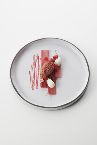 Assembly: Spread the sponge mixture onto a 40 x 60cm silicone mat. Bake at 355°F (180°C) for 9 minutes. Once the sponge has cooled, use a cutter to cut it into the same sizes as your two silicone molds*, then store in the freezer. Make the confit, then pour into the small quenelle mold. Finish off by adding the sponge. Freeze. Pour 15g of raspberry mousse into each imprint in the large silicone mold. Then insert the frozen confit into the center. Add 10g of mousse and seal off each imprint with the sponge. Freeze. Use a toothpick to dip each quenelle into the glaze and sprinkle with crunchy clusters. Use a spray gun to create a velvet effect. Store in the freezer. Pour the yogurt crémeux into the small quenelle mold and freeze. Make the pink strands by dripping some tempered RASPBERRY INSPIRATION into very cold water. Drain and leave to dry. Prepare the rhubarb confit, raspberry gel, raspberry caviar and shortcrust pastry.Assembly: Decorate one side of the plate with some drizzles of raspberry gel. Put three rectangles of rhubarb confit in place. Then add the quenelles of yogurt crémeux. Add a few shards of pressed shortcrust, 15g of raspberry caviar, the RASPBERRY INSPIRATION strands, and a few fresh raspberries. *Molds used: Pavoni PX074 and PX073.