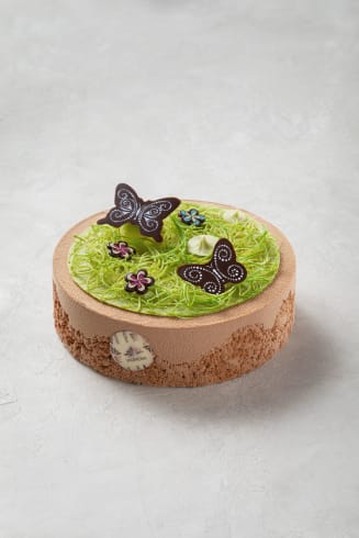 Pour 100g of Vanilla Crémeux each into each 14cm ring. Spread 300g of the sponge mixture into a 60 x 40cm frame and bake. Leave to cool, then cut out 14cm discs. Spread 100g of raspberry compote onto the Vanilla Crémeux sponge, then put a disc of the Vanilla Crémeux sponge in place. Freeze.Make the pressed Breton sablé biscuit. Spread some of the pressed Breton sablé biscuit between a 16cm ring and a 14cm ring (no need to arrange it in any way) and remove the 14cm ring. Create a thin layer of sablé biscuit in the hole left in the ring’s center.Place in the refrigerator. Prepare the crème anglaise-style mousse and pour approx. 50g onto the pressed sablé. Put the insert in place and pour approx. 450g of mousse right up to the top of the ring. Freeze. Once turned out, apply the chocolate spray mix to create a velvet effect.Finishing: Put a metal rolling pin in the freezer. Use a piping bag (no nozzle required) and tempered white chocolate to create thin twig-like strands and place them on a 14cm disc of white chocolate, which has been slightly decrystallized with a heat gun. Use a spray gun to apply a layer of matcha tea spray mix. Finish off with a few VALRHONA SIGNATURE decorations.
