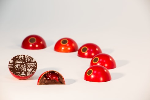 Use a spray gun with red-colored cocoa butter, tempered at 30°C (86°F), to spray the inside of the half-circle molds. Scrape off the excess and allow to crystallize.Repeat the process with gold-colored cocoa butter, tempered at 30°C (86°F). Next, add tempered dark-chocolate couverture to the molds.Turn molds over to let the chocolate run off for a few moments, then level off. Drain the molds between two rulers. Before complete crystallization, trim off the excess on the half-circles.Allow to crystallize.Blend the fruit purée in a fruit processor to smooth the mixture. Add 10% of the Absolu Cristal glaze and with a pastry bag place about 3 g in the molded bonbons. Make the ganache.Fill up each mold with about 4 g of the Guanaja ganache (29-30°C; 84-86°F).Allow to crystallize for 24 h at 17°C (63°F) and 60% humidity.To join, use a heat gun to de-crystalize the edges of the half-circles, then seal with tempered dark-chocolate couverture. This method will ensure a perfect seal.Tip:To ensure smooth undersides of the bonbons, add a thin layer of tempered couverture, then immediately cover with a guitar sheet and flatten, making sure to remove any air with a triangle scraper.Allow to crystalize at 17°C (63°F), then unmold. Use a slightly heated stainless steel palette and slide it over the bonbon to melt it just slightly, so a “pupil” appears.