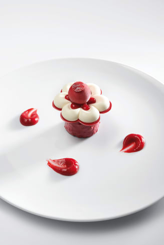 Make the confit, the whipped ganache, the sorbet and the frosting.Make the muffin mix and pour approx. 25g into each 4.5cm-diameter ring.Bake at 320°F (160°C) for approx. 15 minutes. Freeze.Use the crunchy frosting to ice the muffins.Make thin sheets of pre-hardened RASPBERRY Inspiration between two pieces of confectionery dipping paper and cut them into flower shapes, each with six petals and an approx. diameter of 8cm. Leave to harden.Put the RASPBERRY Inspiration muffin in the center of the plate.Use the confit to create a decorative design around the plate.Whip up the YUZU Inspiration whipped ganache and place six scoops of it around the RASPBERRY Inspiration flower. In each scoop, make an indent that runs into the center of the flower using a teaspoon. Fill the indents with raspberry confit.Then stick the flower onto the muffins using a dab of whipped ganache and put a scoop of raspberry sorbet with a diameter of approx. 3cm at its center. Finish off with your own Customized Logo Decoration.