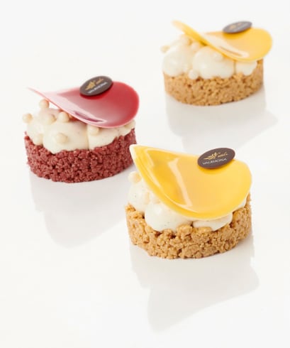 Assembly: Prepare the cream mix, namelaka and pressed shortcrust. Make rounds of pressed shortcrust (approx. 30g each) using a 6.5cm diameter ring. Store in the refrigerator. Make a spiral of cream mix on top of the pressed shortcrust rounds (approx. 20g) using a piping bag with a 6mm diameter plain round nozzle. Store in the freezer. Add some namelaka droplets (approx. 25g) to the spiral of cream mix using a piping bag with a plain round 6mm-diameter nozzle. Freeze. Add a layer of neutral glaze.Finishing: Sprinkle on some Opalys crunchy pearls and put a curved 7cm-diameter disk of Inspiration in place.