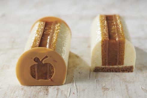 ASSEMBLYMake the caramel sponge batter and spread onto a silicone baking sheet in a 57 × 37cm frame. Bake at 340°F (170°C) for 10-12 minutes.Spread crémeux onto each sheet of cake and freeze.Place a sheet of frozen cake into a frame so that the crémeux is on top. Spread on compote and layer on the second sheet of cake so that its crémeux is facing the compote.Freeze this yule log insert. Cut out 52 × 6cm strips.Line your “Large U-shaped” Yule Log Molds (ref. 2171) with a Valrhona Signature 3D Texture Sheet.Position a strip of frozen insert vertically inside each yule log mold. Freeze.Make the pressed shortcrust pastry and spread out six 52 × 6cm strips. Leave them to set in the refrigerator.Make the rice pudding mousse. Pour the rice pudding mousse down each side of the insert and place a strip of buckwheat shortcrust pastry on top. Freeze.FINISHINGTurn out the yule logs.Make the apple glaze and spray onto the frozenyule logs.