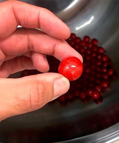 Once all of the STRAWBERRY INSPIRATION is applied, remove the product from the panning machine. Warm the panning machine and scrape off the excess. Reserve this for another use. You will have about half the amount of STRAWBERRY INSPIRATION left over from the 1400g that was scaled for the recipe.