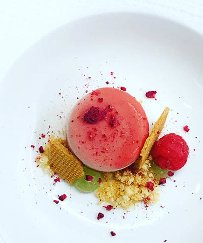 This dish is garnished with fresh raspberries, freeze-dried raspberries, and fresh flowers.