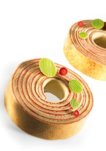 Make the two 60 x 36cm cakes. Once cooked and cooled, dip each cake in 200g Strawberry Syrup. Set aside in the freezer. Once frozen, spread 250g Strawberry Jam on top of each. Set aside in the freezer. Whip the Pistachio Praliné Ganache and spread 500g on each cake. Blast freeze, saving the remaining ganache for finishing. When blast-frozen, cut into twelve 4cm-wide strips and four 4.5cm-wide strips (60cm long). Assemble the entremets on a chilled marble surface. Roll three 4cm strips and one 4.5cm strip one after the other into a coil, with the wider strip on the outside. Use the remaining ganache to cover the ends of the dessert and stick the Pressed Pistachio Praliné Shortcrust on top, leaving the inside of the spiral hollow. Blast freeze.TIP: The 4.5cm-wide strip of cake ensures the Pressed Pistachio Praliné Shortcrust is at the correct height. Turn the entremets over and spray with the Absolu Cristal Spray Glaze.To make the chocolate decorations, brush some green cocoa butter onto some acetate sheets. Temper some white chocolate couverture and roll out a thin layer between two colored acetate sheets. Before it sets completely, cut out some circles with a plain nozzle. Leave to set. Decorate the entremets with a few strawberries and the chocolate decoration.