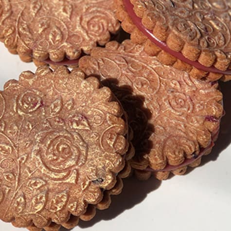 Cool and pipe strawberry ganache onto one cookie then sandwich another on top.Brush lightly with gold luster dust.