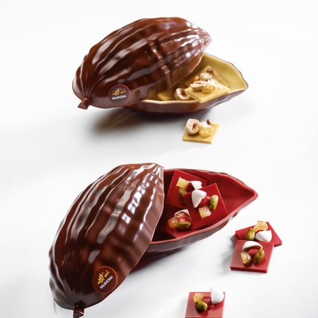 Beat the egg whites at medium speed. Add the sugar gradually. When the whites are firm, gently incorporate the confectioner's sugar with a spatula. Pipe 18g of meringue on 10 silicone half-spheres. On half of the meringues place the crushed freeze dried raspberries. On the second half, cover with shaved BAHIBÉ 46% chocolate. Bake in a ventilated oven at 100°C (212°F) for 2 hours.