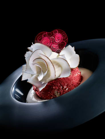 Fill the center of the Meringues with Raspberry Coulis. To plate the desserts, pipe half with 20g of Coconut Ganache, and half with 20g of BAHIBÉ Ganache. Top the Coconut Ganache with shaved coconut, and top the BAHIBÉ Ganache with shaved chocolate.Decorate with a chocolate heart. At the time of serving, make a cloud of Yogurt Foam and then add the Meringue. Serve.