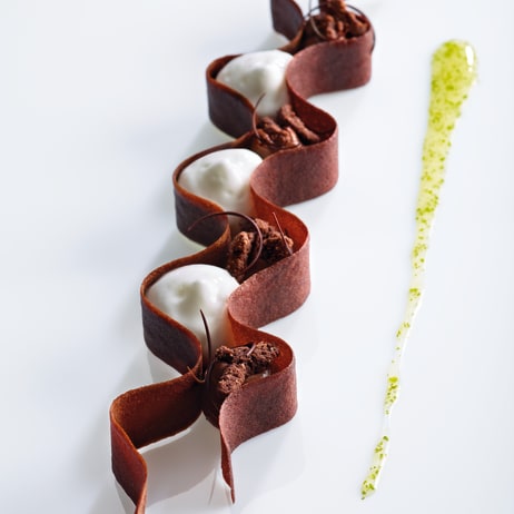 Make the vanilla Opalys coating, then dip in the vanilla ice cream rounds using a toothpick. Set aside until you are ready to serve.